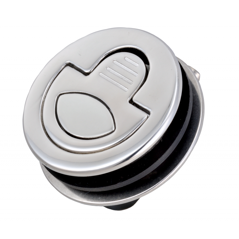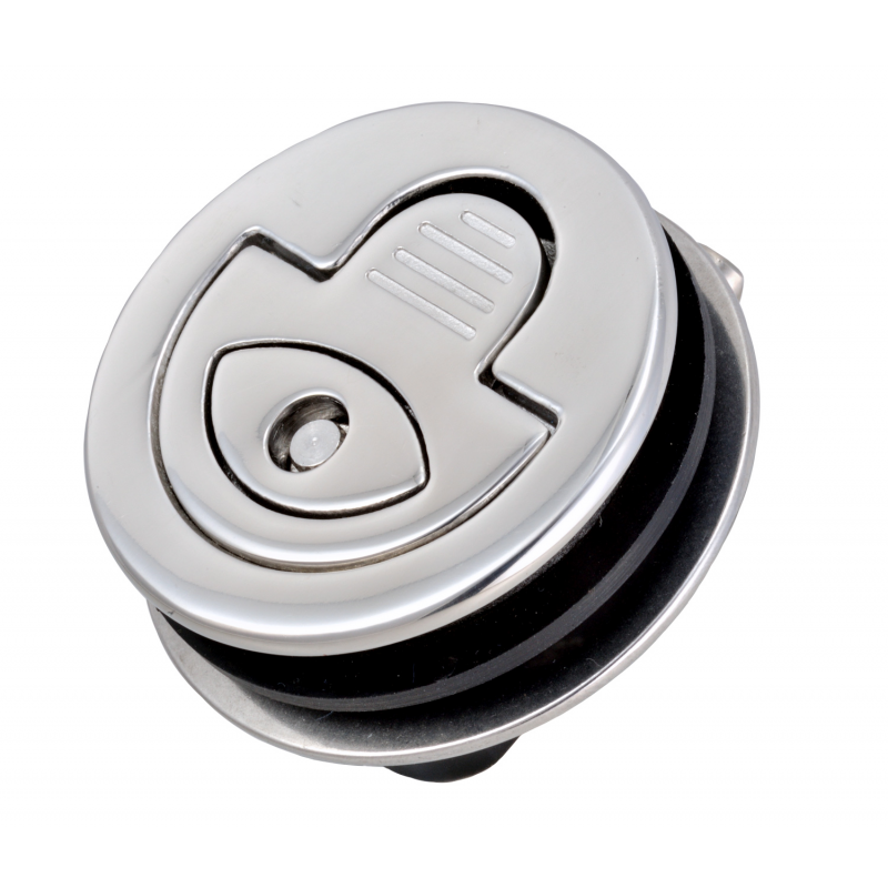 Chiusurain fusione di acciaio inox AISI 316. Completamente stagna, per porte, sportelli e paglioli esterni. Maniglia a molla, fermo a scatto e controflangia per il fissaggio. Spessore massimo del portello 22 mm. utilizzando viti più lunghe.