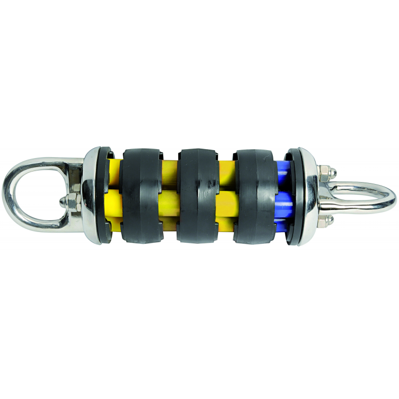 Ammortizzatori d’ormeggio con funzionamento adelastometri. Si distinguono per i componenti adaltissima tecnologia come l’inox HR (17/4PH) e glielastometri speciali. I componenti di fine corsa e idistanziali sono realizzati in nylon speciale con U.V.Absorber. Acciaio inox HR resistenza 120-140 kg./mm2. Componenti di fine corsa e distanziali in nylon speciale U.V. Absorber. Elastomeri con proprietà eccezionali da -40°C a +120°C e con resistenza di oltre 400.000 cicli a fine corsa. Molla Ø mm. 100, lunghezza mm. 440, allungamento mm. 90, per barche fino a 17/25 ton., carico di rottura kg. 27000, carico di lavoro kg. 14000, peso della molla 3,4 kg.