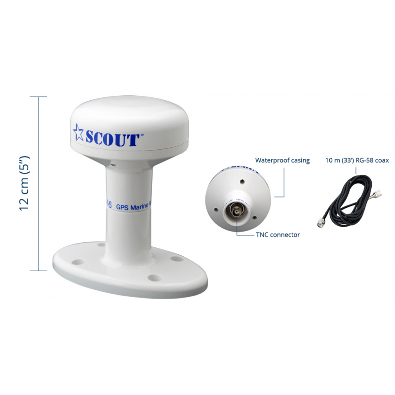 Antenna GPS - GLONASS ad elevate prestazioni che supporta il sistema SBAS (WAAS, EGNOS, MSAS). Sistemi SBAS (Satellite Based Augmentation System) sono innovativi sistemi legati alla navigazione satellitare il cui scopo è quello di fornire ai ricevitori GPS e GLONASS una informazione aggiuntiva che consente di “correggere l’errore” dei dati di posizionamento ricevuti. Il processore di posizionamento interno a 50 canali consente un tempo di prima localizzazione (TTFF) inferiore a un secondo, mentre il motore di acquisizione dati, appositamente studiato per uso nautico, permette numerose ricerche multiple tempo/frequenza per una sintonizzazione immediata con i satelliti. Il design innovativo e la tecnologia del ricevitore eliminano le fonti di interferenza e mitigano gli effetti di segnale multiplo, conferendo una performance di navigazione eccellente anche nelle condizioni meteo più avverse. Guadagno 27 dB. Alimentazione, proveniente dallo strumento, su cavo coax da 2,5 a 5,5 Vdc. Cavo di collegamentoconnettorizzato da 10 mt. Dim.mm. 110 x 74 x 116 h