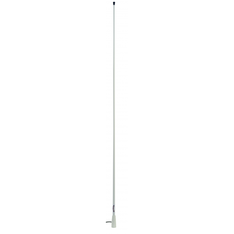 Antenna VHF in fibra di vetro, cm 150. Freq. 156-162 Mhz, guadagno 3 db, impedenza 50 ohms, SWR = 1,3 a 156,8 MHz, max input power 100 W. Cavo coassiale (non tagliabile) da 4,5 mt, con connettore Pl259. Ideale per gommoni e barche a motore.