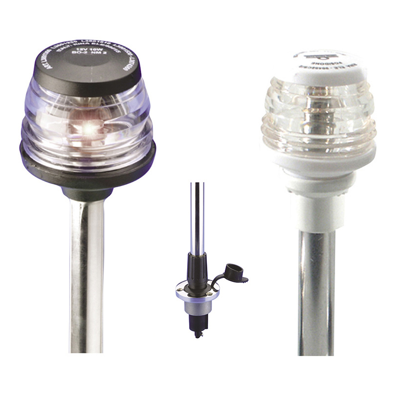 Asta in acciaio inox Ø mm. 19 estraibile, con innesto a baionetta, fanale a 360°, H. mm. 1000. Omologati R.I.Na. e M.M.M per imbarcazioni fino a 20 mt. Con base ad incasso su piano flangia Ø mm. 63, foro Ø mm. 40, prof. mm. 55.