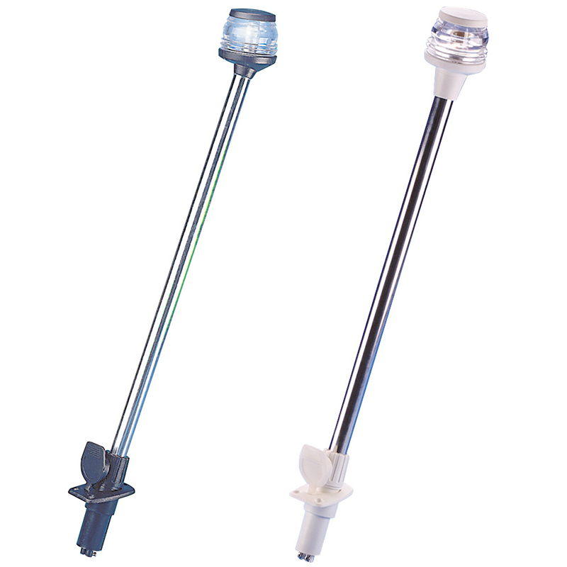 Asta in acciaio inox Ø mm. 19, estraibile, con innesto a baionetta in plastica, fanale a 360°, base mm. 65x44x65 prof., H mm. 600. Omologati R.I.Na. e M.M.M per imbarcazioni fino a 20 mt.
