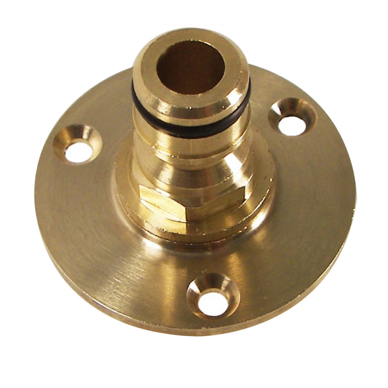 Raccordo maschio da 1/2’, compatibile con tutti i sistemi rapidi in commercio in ottone e plastica, completo di rondella Ø mm. 50 con tre fori di fissaggio.Ideale per creare punti di collegamento alle manichette per il lavaggio ponte ecc...