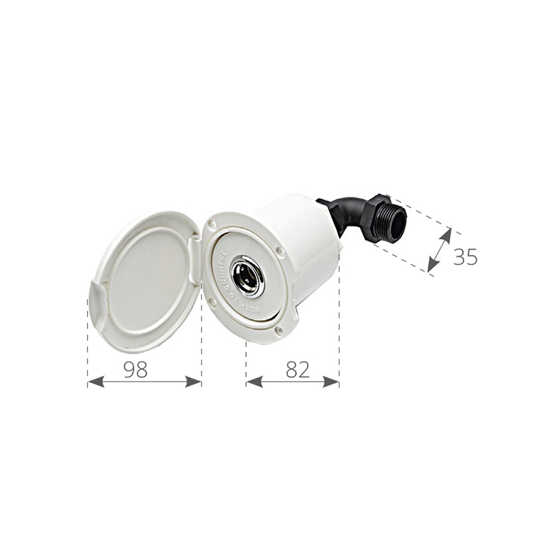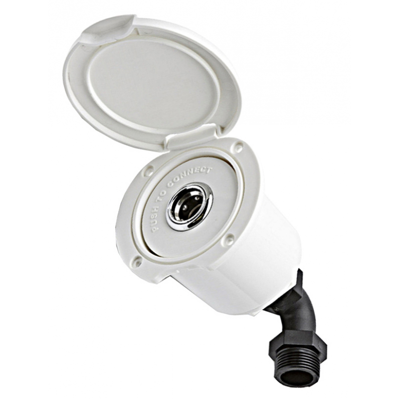 Attacco rapido femmina presa di coperta per acqua di mare (o dolce) da utilizzare a bordo perlavaggio coperta o servizi. Completo di contenitore in ABS bianco e valvola di non ritorno, attacco a gomito filetto maschio da 3/4”. Coperchio bianco