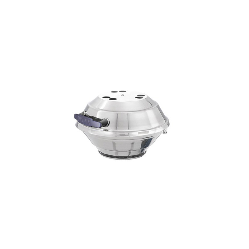 Barbecue a gas in acciaio inox lucidato a specchio provvisto di regolatore di pressione, coperchio utilizzabile come paravento, manico in plastica resistente al calore e griglia di cottura radiante. Funziona con bombole di gas CV470 monouso Camping Gaz (non inclusa). Kit di fissaggio venduto separatamente. Dimensioni Ø esterno mm. 381