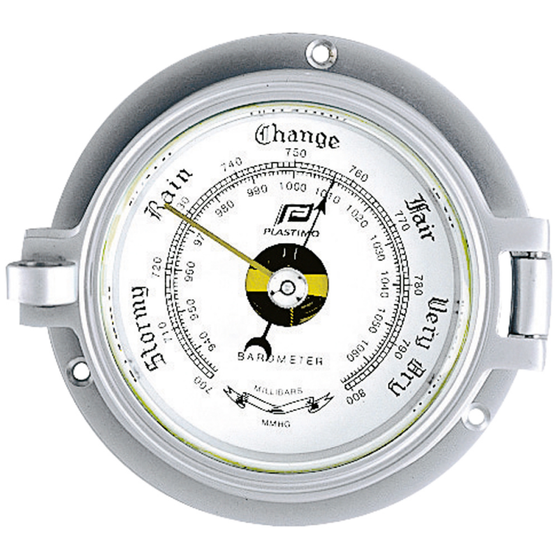 Barometro in alluminio cromato opaco con meccanica di precisione a movimento aneroide ad alta sensibilitàcon catena metallica integrata, vetro minerale smussato. Modello apribile.