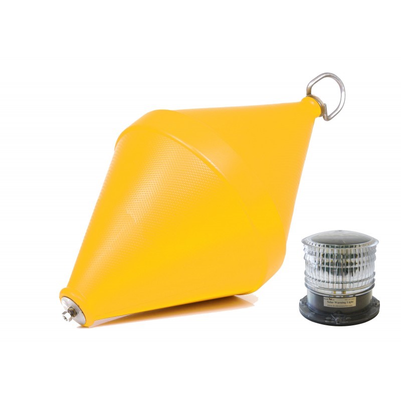 Boa in polietilene soffiato con asta passante e girella in acciaio inox, riempita di poliuretano a cellule chiuse. Segnaletica con luce bianca a LED, non omologata, intermittente ad alta visibilità con pannello solare ad attivazione crepuscolare.
