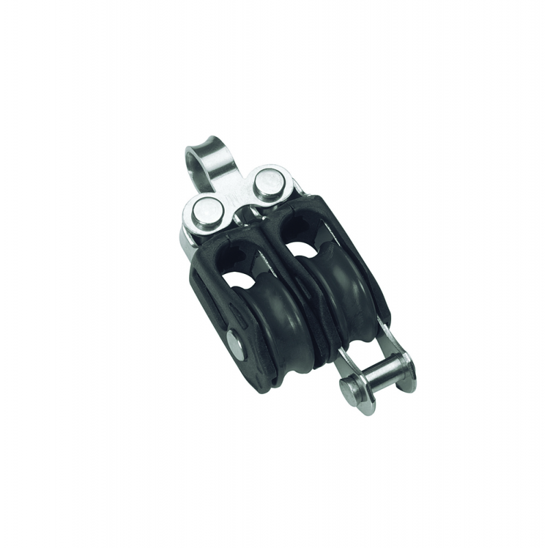 SERIE 0 -Bozzello doppio con occhio fisso ed arricavo, Ø cima max mm. 5, max carico di lavoro kg. 275, carico di rottura kg. 550, dimensioni puleggia mm.20 x 8, lunghezza mm. 63.5