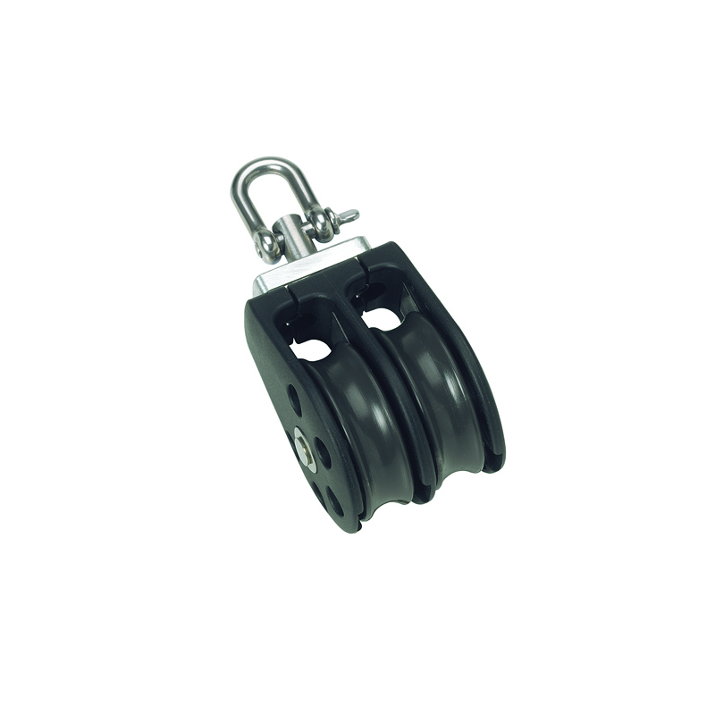 SERIE 2 - Bozzello doppio girevole, Ø cima max mm. 8, max carico di lavoro kg. 370 carico di rottura kg. 740, dimensioni puleggia mm.35 x 12, lunghezza mm. 80