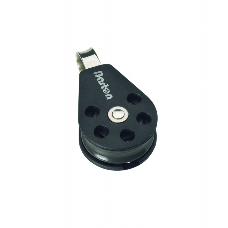 SERIE 2 - Bozzello con puleggia, Ø cima max mm. 8, max carico di lavoro kg. 355 carico di rottura kg. 710, dimensioni puleggia mm.35 x 12, lunghezza mm. 65