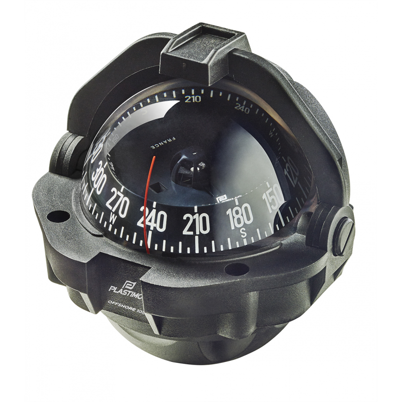 Bussola Offshore 105 Ø apparente mm. 91. Rosa con graduazione ogni 5°, per barche a motore da mt 5 a 10, illuminazione di serie a 12-24 V LED. Calotta di protezione retrattile in tre parti scorrevoli. Installazione ad incasso orizzontale o su staffa con l’apposito kit.