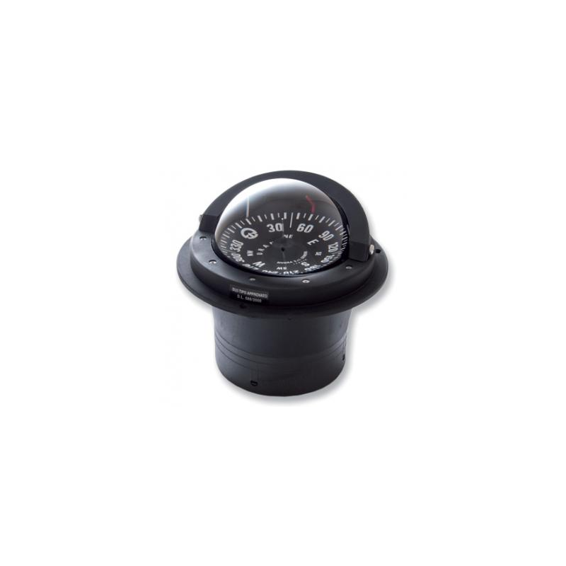 Bussola serie Urania BU3 Ø apparente 4’ (100 mm.). Sospensione cardanica interna. Compensazione incorporata. Illuminazione di serie 12V. Schermo antiriflesso. Versione normale e alta velocità (superiore a 25 nodi). Rosa nera con graduazione bianca, installazione ad incasso su piano orizzontale.