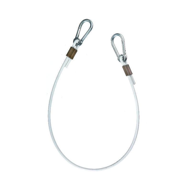 Cavetto di sicurezza in acciaio inox rivestitoin plastica, munito di un moschettone inoxalle estremità, per motori fuoribordo, fino a25 HP. Lung. mm. 600