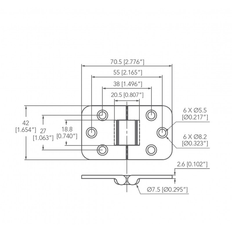 Cerniera in acciaio inox AISI 316 lucidata a specchio con arresto per tavoli dim. mm. 70x42, spessore mm. 2,6