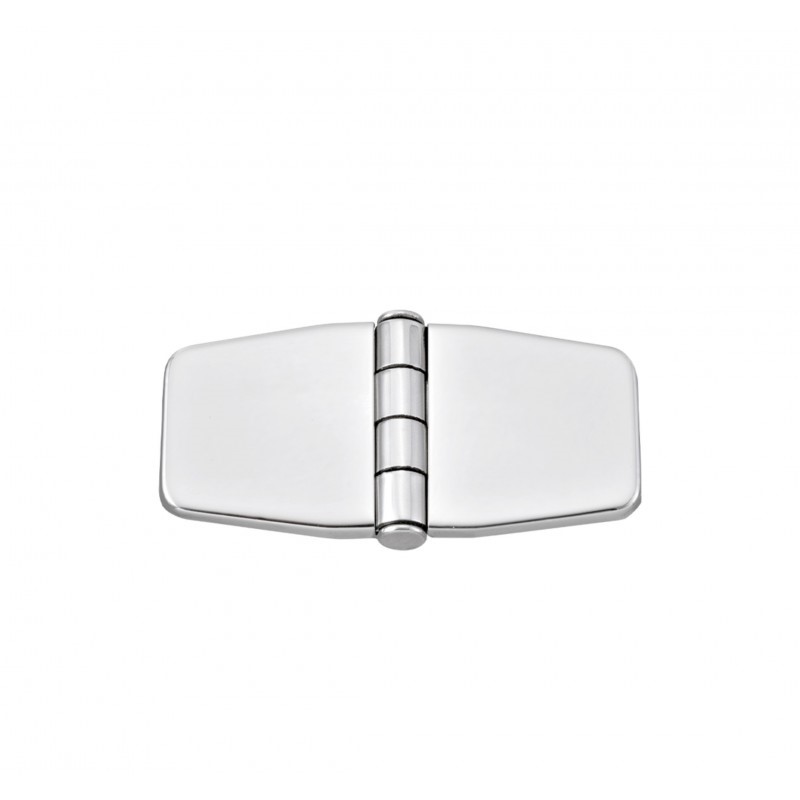 Cerniere con copertura in acciaio inox AISI 316 spessore mm.2. Tramite il nastro biadesivo 3m vhb premontato sulla copertura stessa, permette di nascondere le viti della cerniera dopo il montaggio, con grande effetto estetico. dim. mm. 76X37, perno semincassato.