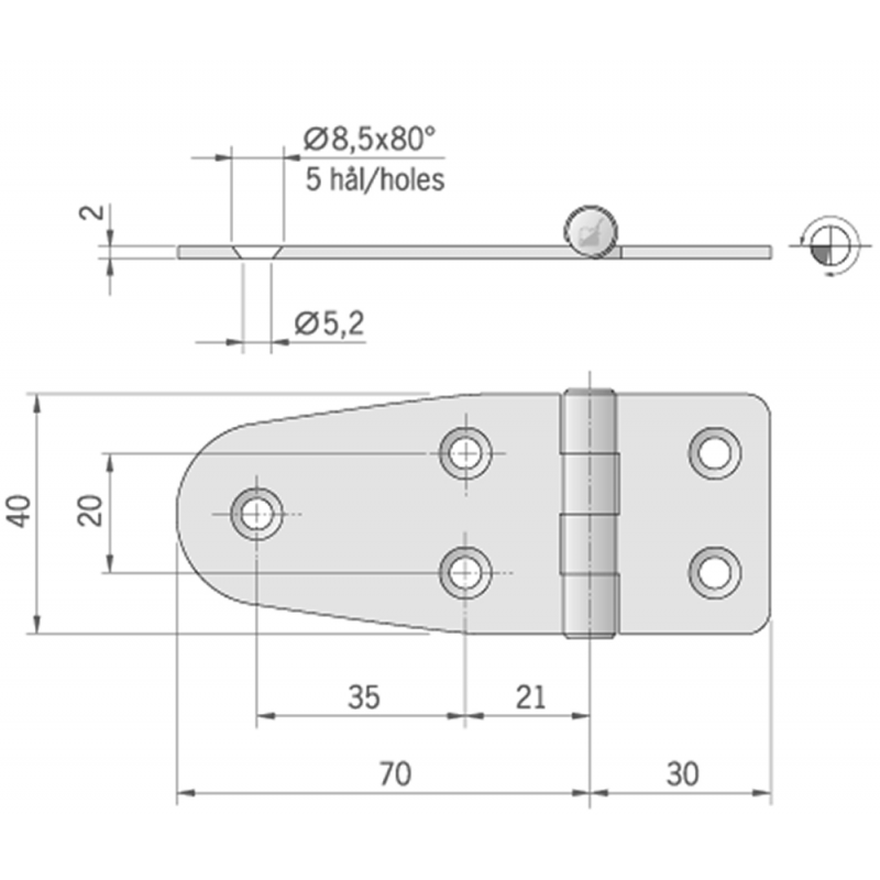 Cerniera lucidata a specchio in acciaio inox AISI 316. Spessore mm. 2, perno Ø mm. 9 intestato
