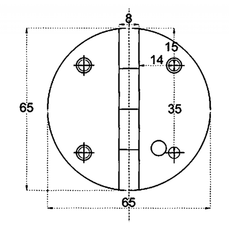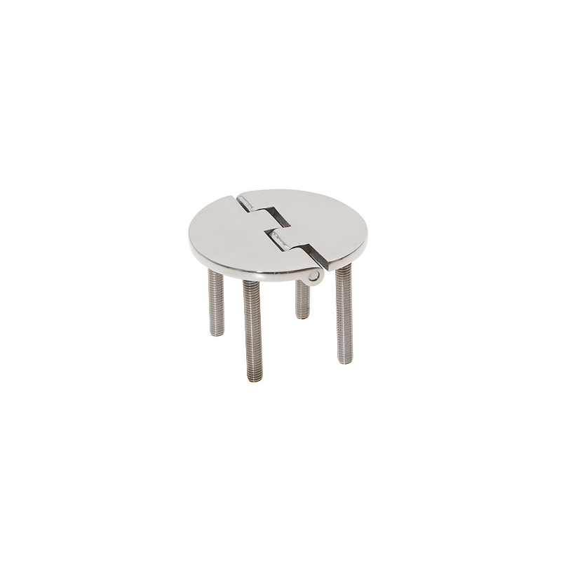 Cerniera lucidata a specchio in acciaio inox AISI 316. Spessore mm. 4, nodo rovesciato, apertura 95°, dimensioni Ø mm. 65, fissaggio con prigionieri lunghi mm. 45.