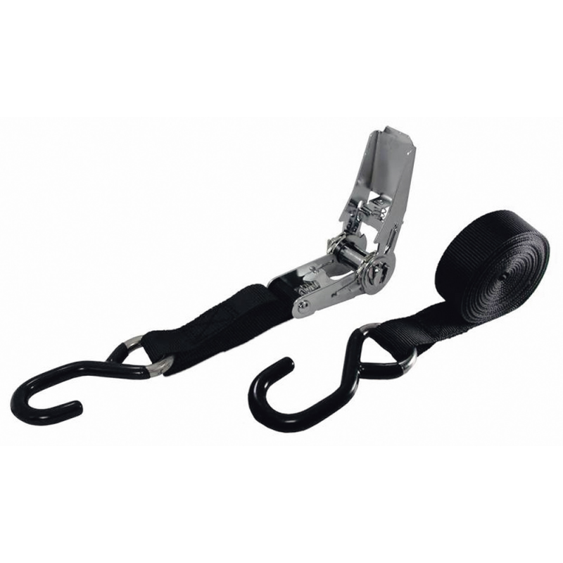 Cinghia di fissaggio in poliestere, sistema di arresto e di regolazione della tensione con cricchetto tenditore. Ganci di ancoraggio in acciaio inox rivestiti in vinile per non danneggiare il supporto. Lunghezza cm 454 larghezza cm 2,5, carico di rottura kg 700