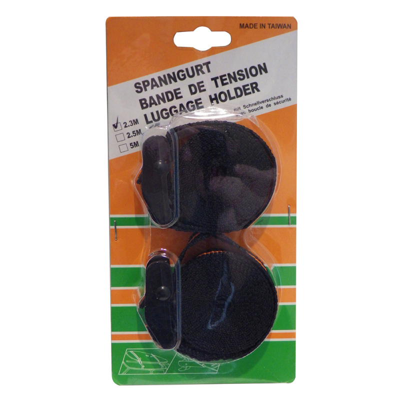 Coppia cinghie di fissaggio in polipropilene con fibbia di arresto e di regolazione della tensione a sgancio rapido. Lunghezza cm 230 larghezza cm 2,5, carico di rottura kg 200