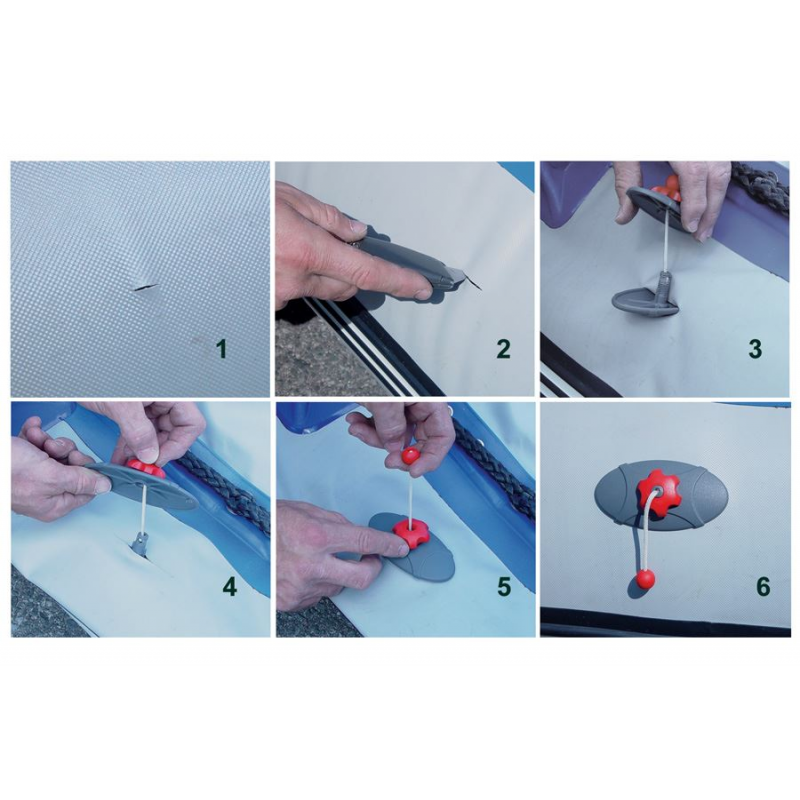 il sistema è composto da due piastre in grado di riparare facimente e velocemente senza colla o nastro piccoli strappi o spaccature nei gommoni,sopra o sotto la linea di galleggiamento, zattere di salvataggio e qualsiasi prodotto gonfiabile.- Aprire e inserire la piastra di base nella divisione- Tirare le piastre insieme, attraverso la spaccatura, usando il cordino- Con le due piastre tirate insieme, basta serrare a mano il dado per unatenuta stagna e impermeabile- Può essere riutilizzato.