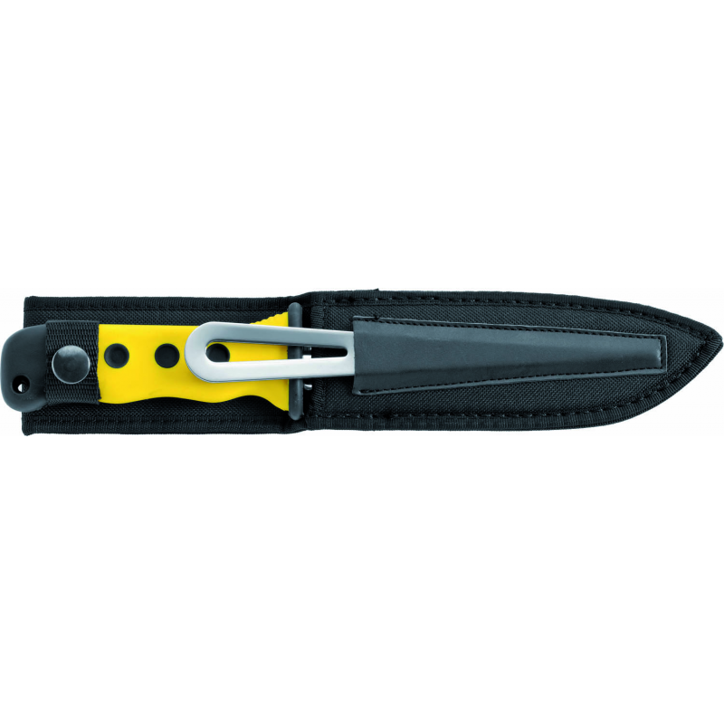 Coltello con lama in acciaio inox e cavigliera con asola aprigrilli. Impugnatura antiscivolo colorata in PP con PTE sovrastampato. Completo di fodero in tessuto nylon, lunghezza totale mm.285 lunghezza lama mm. 138