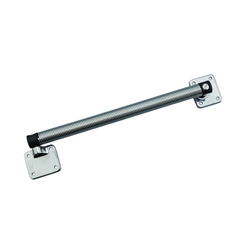 Compasso a molla in acciaio inox per apertura portelli . Dim. Ø mm. 21,5 lunghezza mm. 320. Basi di fissaggio rettangolari dim. mm.50x45.
