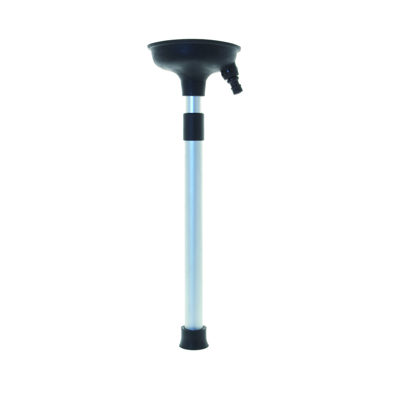 Cuffia in gomma Ø mm. 140, con innesto rapido dell’acqua (tipo giardinaggio) per lavaggio motori entrobordo. Tubo telescopico da mm. 460 a mm. 770 in lega leggera, per adattarsi alle varie altezze da terra della presa a mare.
