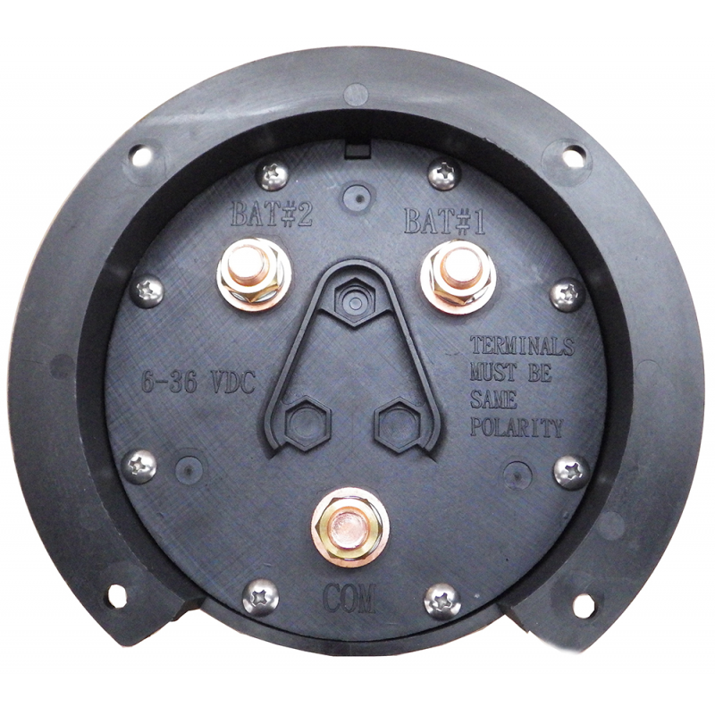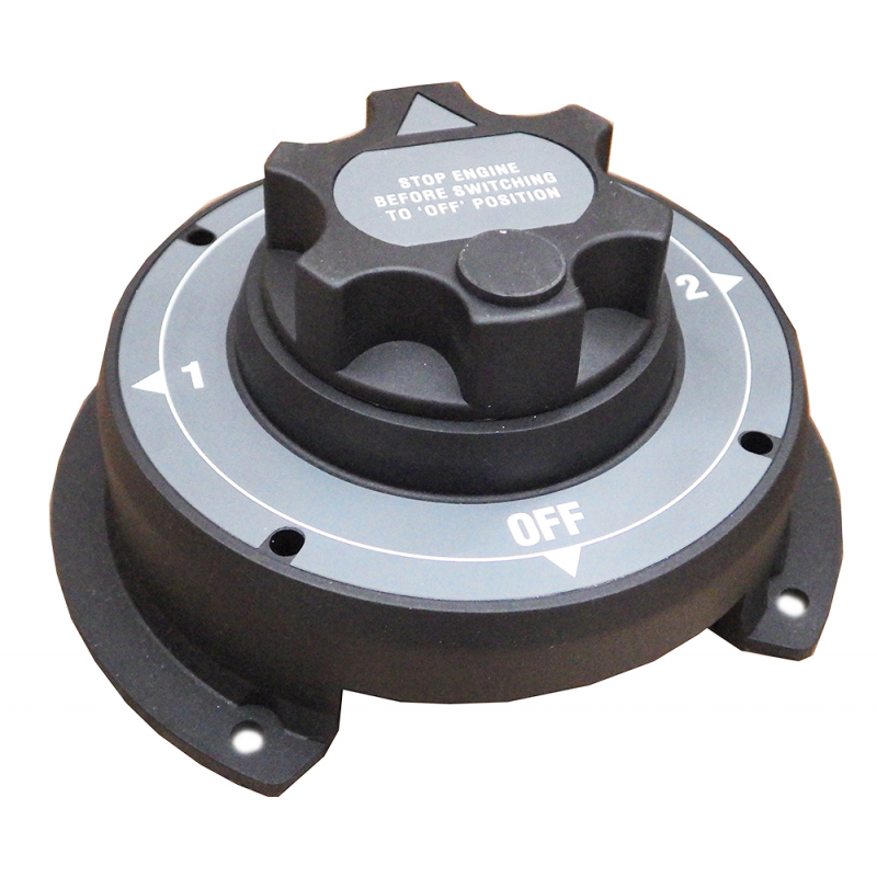 Deviatore staccabatteria per usare una o più batterie e staccare la corrente. Etichette fluorescenti visibili al buio. Terminali Ø mm. 10. Universale 6/30V, 400A intermittente, 300A in continuo. Dim. Ø mm. 160 x 75 h. Posizioni difunzionamento : OFF - 1 - 2 - BOTH