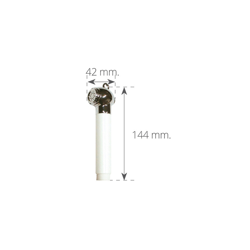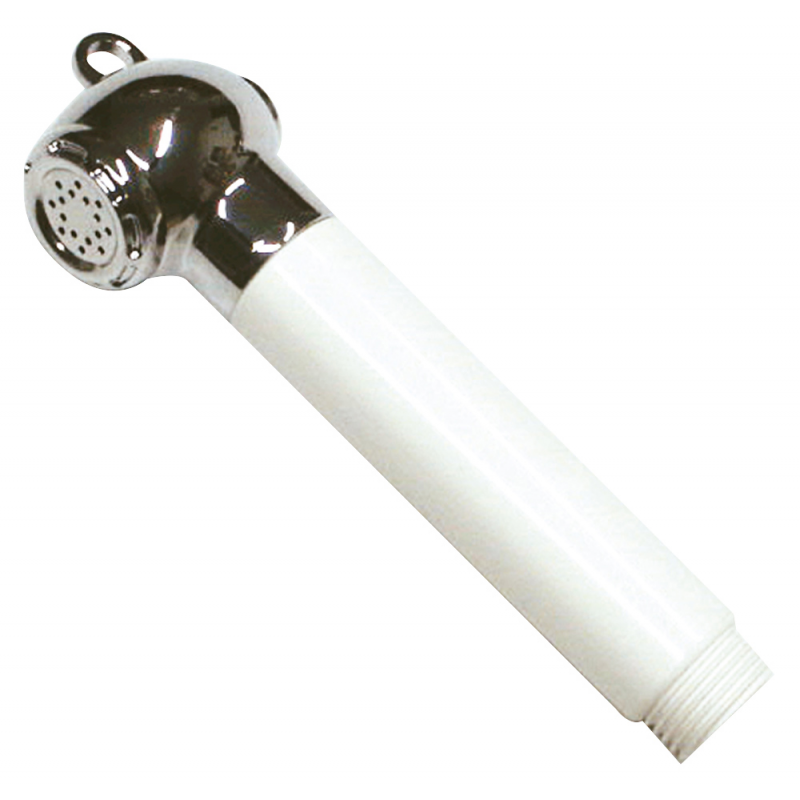 Doccia con testa in ottone cromato e impugnatura in ABS bianco, con pulsante push-off con ritorno automatico. Attacco 1/2” maschio. Per tubo art. 2424212/4 o similari.