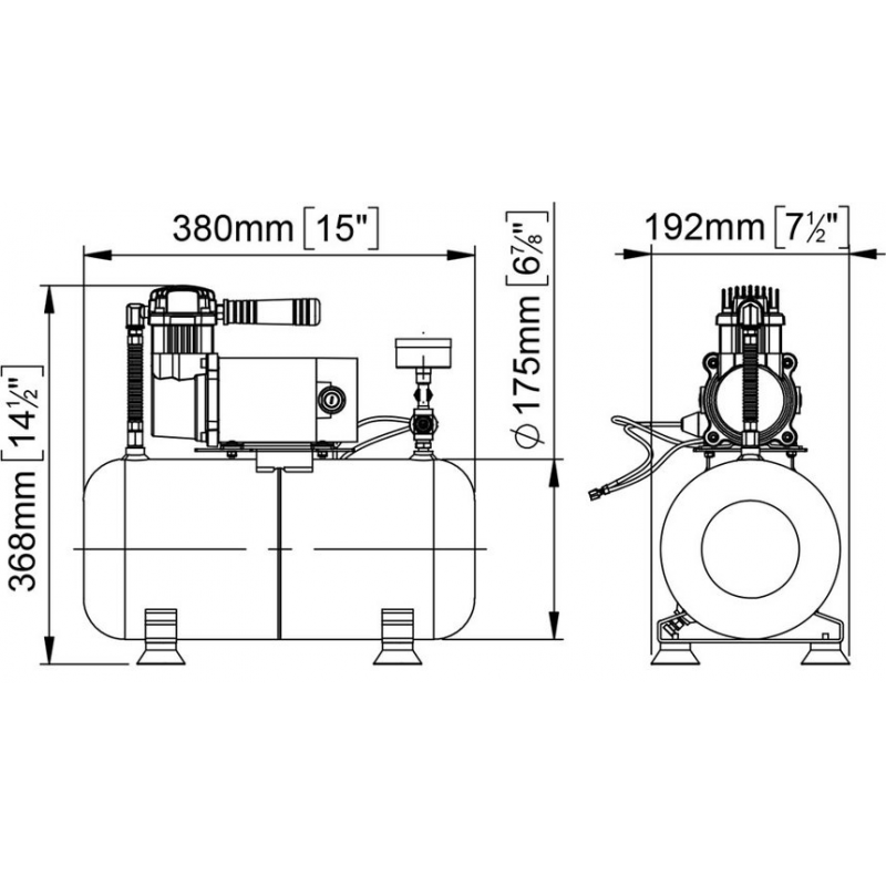 Elettrocompressore compatto con serbatorio da 8 lt. per utilizzo con trombe pneumatiche omologate e servizi di bordo. Pressione massima 8 bar, motore 240W, portata d’aria 47 lt/min circa. Peso kg. 9. Dimensione 368 x 380 x 192