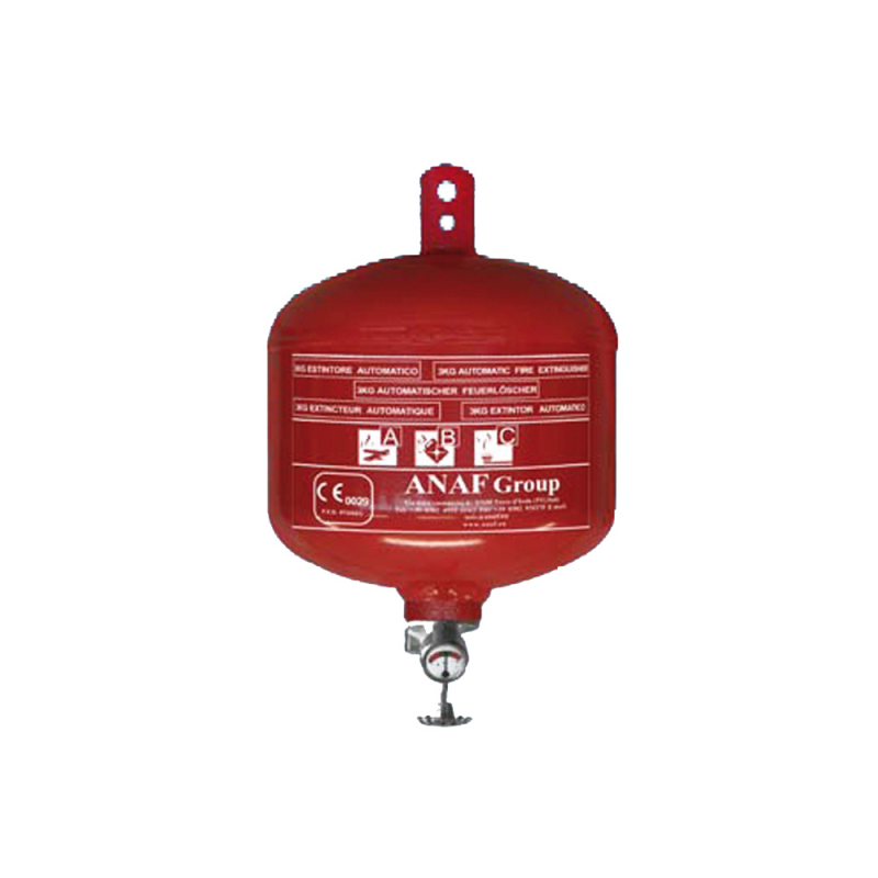 Estintore automatico a polvere,dotato di manometro,classi di fuoco ABC, installazione a soffitto.Si apre automaticamente alla temperatura di 68°, dimensioni mm Ø 180 x 280h , satura circa m3. 4. CLASSI DI FUOCO ABC