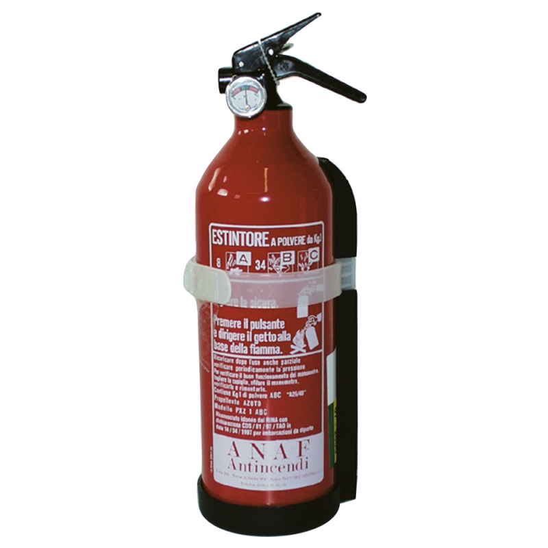 Estintore a polvere in alluminiocompleto di supporto. Certificati R.I.Na., MED 2014/90/EU, EN3, CE 0029/2017, P.E.D. 2014/68/EU. Sono classificati secondo la loro capacità di spegnere differenti tipi di fuoco. Un coefficiente indica la capacità di estinguere e una lettera il tipo di fuoco che può essere spento. A - Fuoco di materie secche (carta, legno, tessili, ecc.) B - Fuoco di liquidi(idrocarburi) C - Fuoco di gas (butano - propano). Dimensioni Ø mm 82 x h mm. 295