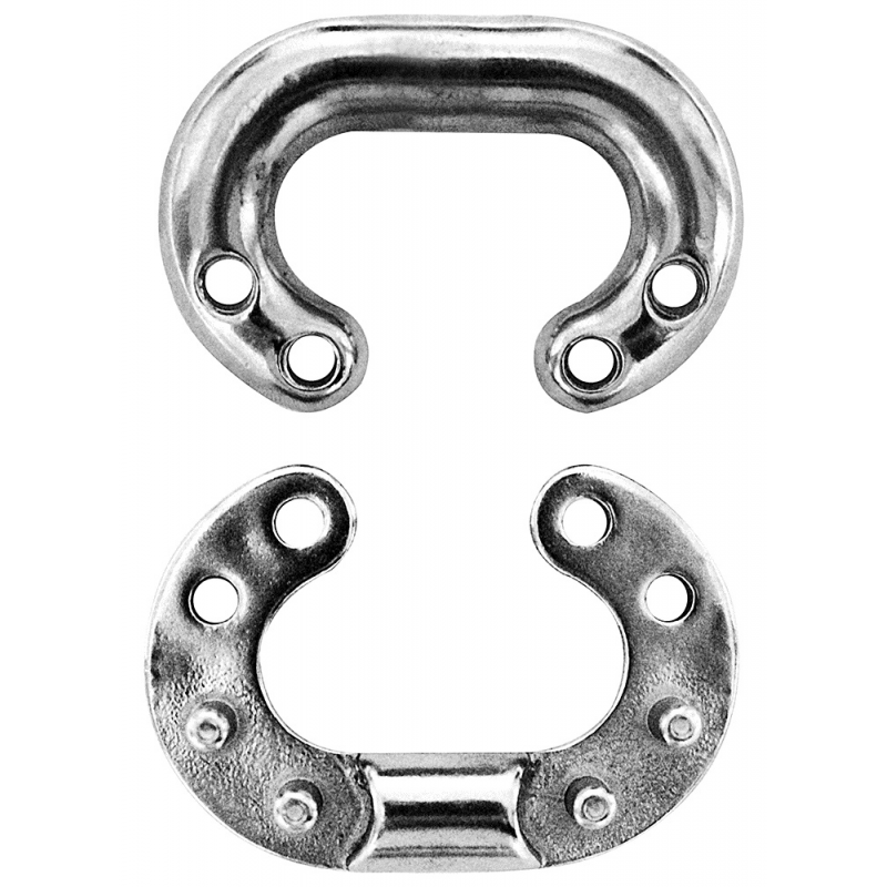 Falsamaglia in acciaio inox AISI 316 di giunzione per catena calibrata, con nr. 8 perni di tenuta per un’alta resistenza al carico di lavoro e rottura. Ø mm.6. Dim interne maglia mm. 33x23.