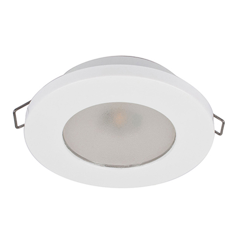 Faretto stagno IP40 a 2 LED ( 100 Lumen ) ad alta luminosità, luce bianca calda con cornice circolare in plastica a finitura bianca RAL 9010.Sensibile alla polarità. Fissaggio con molle