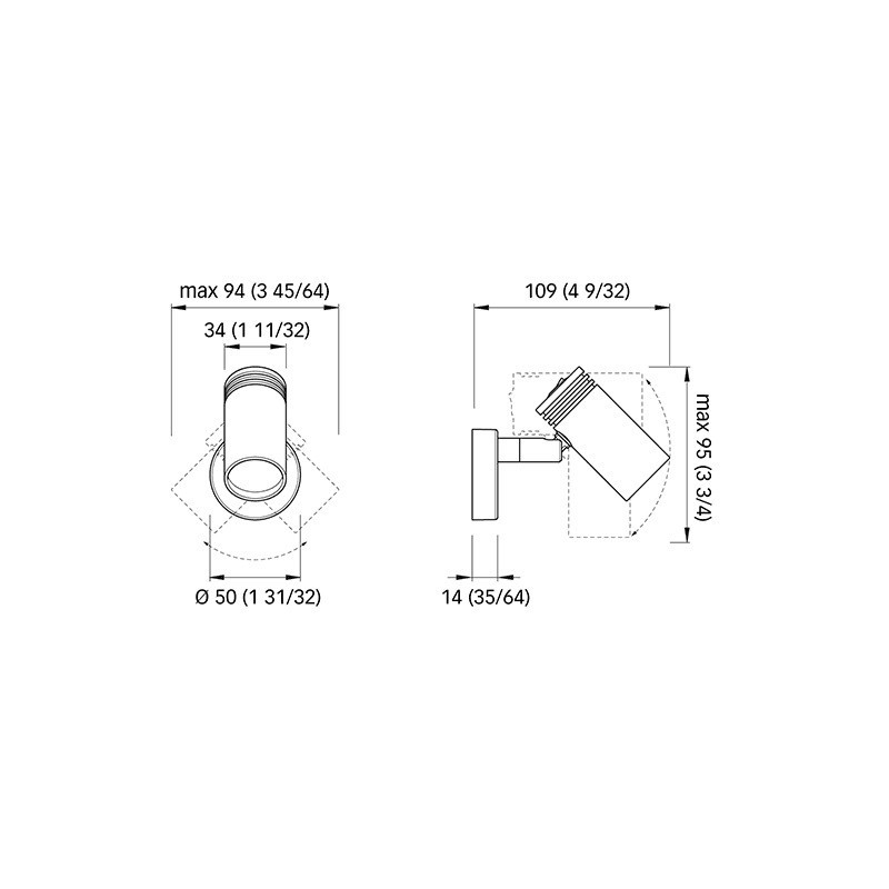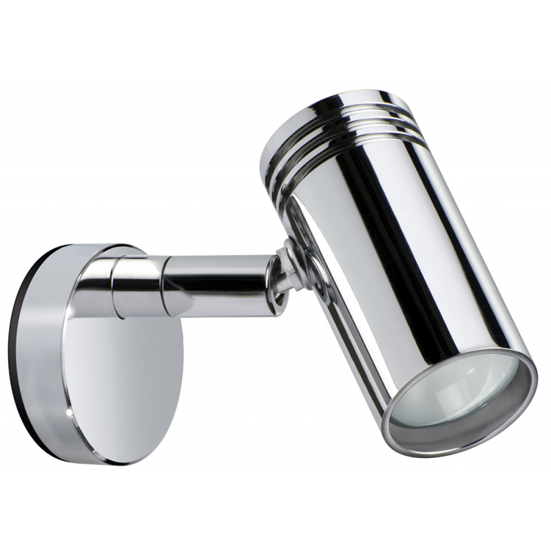 Faretto orientabile da interno fabbricato in alluminio con finitura cromata, dotato di interruttore. Luce bianca calda (140 lumen). Fissaggio a parete con viti. Sensibile alla polarità.