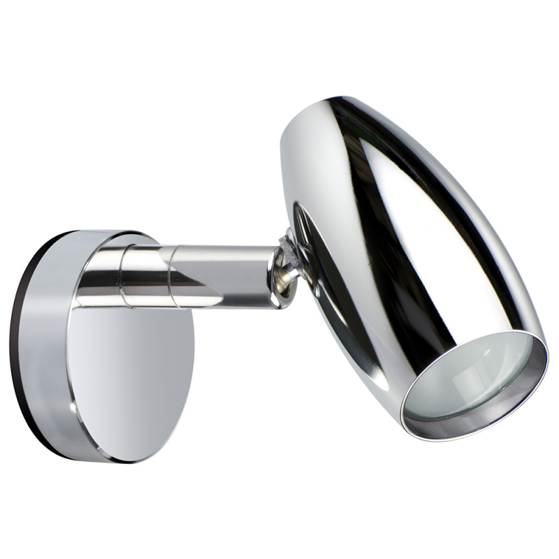 Faretto orientabile da interno fabbricato in alluminio con finitura cromata, dotato di interruttore. Luce bianca calda (140 lumen). Fissaggio a parete con viti. Sensibile alla polarità.