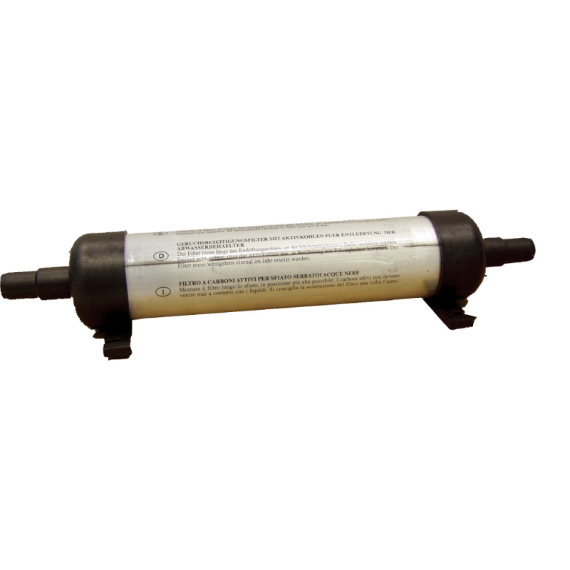 Filtro in alluminio e nylon a carboni attivi per sfiato serbatoi acque nere.Lunghezza mm. 200. Portagomma Ø mm 17 e Ø mm 19.