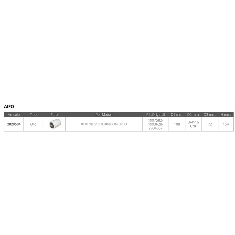 Filtro olio dim.Ø est.mm.108 Ø guarnizione mm. 72 altezza mm.154 passo 3/4’ - 16 UNF