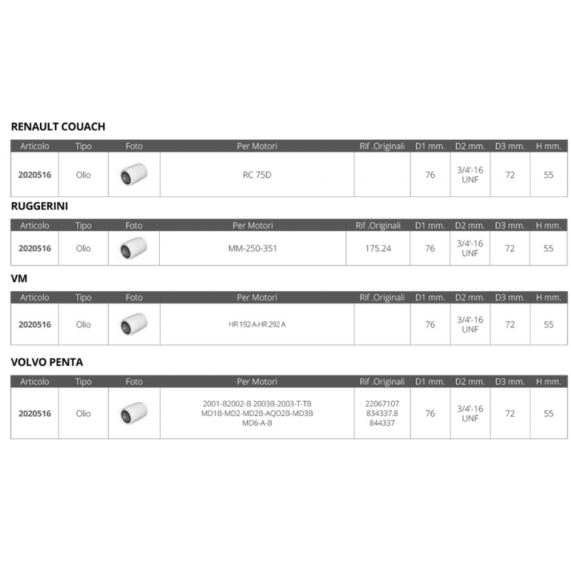 Filtro olio dim.Ø est.mm.76 Ø guarnizione mm. 72 altezza mm.55 passo 3/4’ - 16 UNF