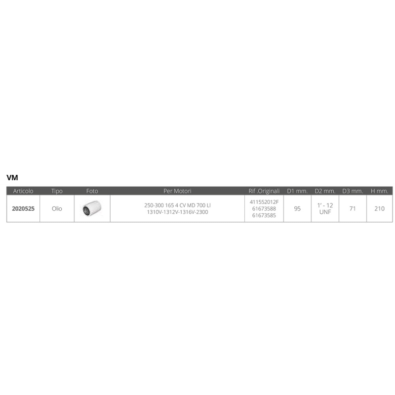 Filtro olio dim.Ø est.mm.95 Ø guarnizione mm. 71 altezza mm.210 passo 1’ - 12 UNF