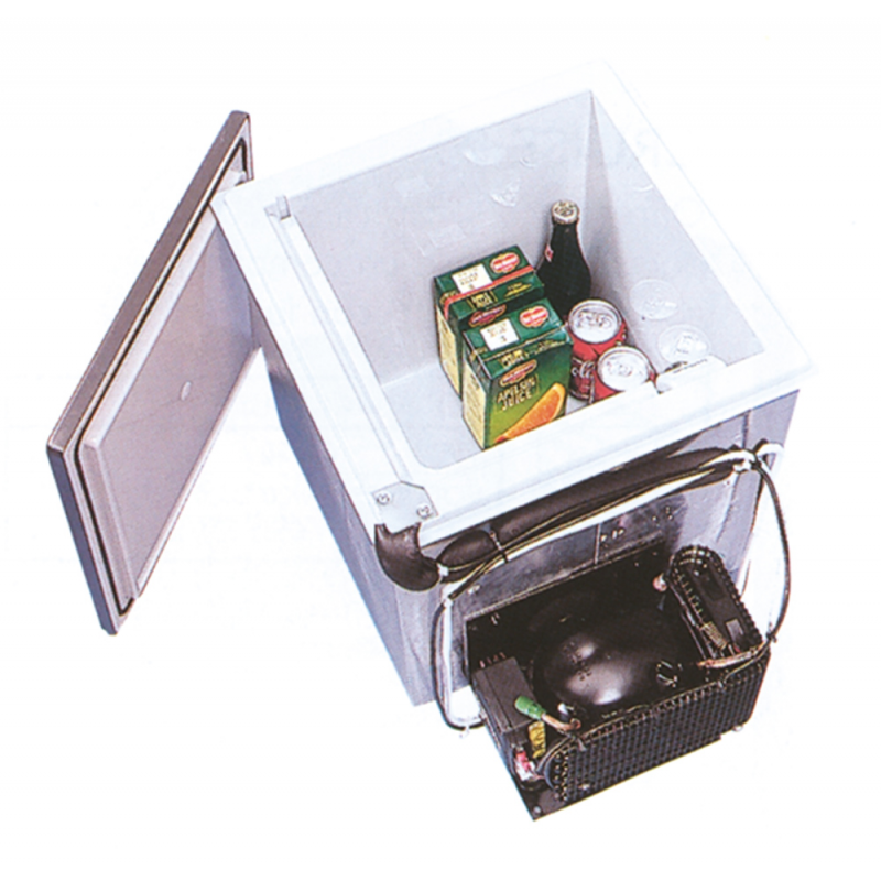 Rivestimento interno in acciaio inox e fondo in plastica. Può essere dotato di guide scorrevoli. Compressore ventilato installato nella parte inferiore del latocorto, che può essere spostato fino ad una distanza di mt. 1,5. Prof. motore mm. 165. Dim. mm. 450(+165) h x 340 lar. x 496 lung.
