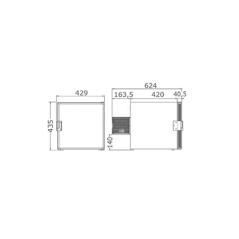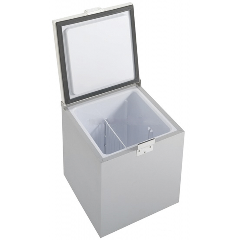 Prodotto molto versatile che può essere utilizzato come frigorifero o come congelatore. Può essere installato con apertura dall’alto (built-in box) o frontale. Il compressore è remotizzabile fino a 1,3 mt. di distanza. Alimentazione 12/24V. Consumo con apertura frontale 0,186 Kwh/24h, con apertura superiore 0,786 Kwh/24h. Peso kg. 17,6. Raggiunge una temperatura di -10° C solo se installato in apertura a pozzetto.