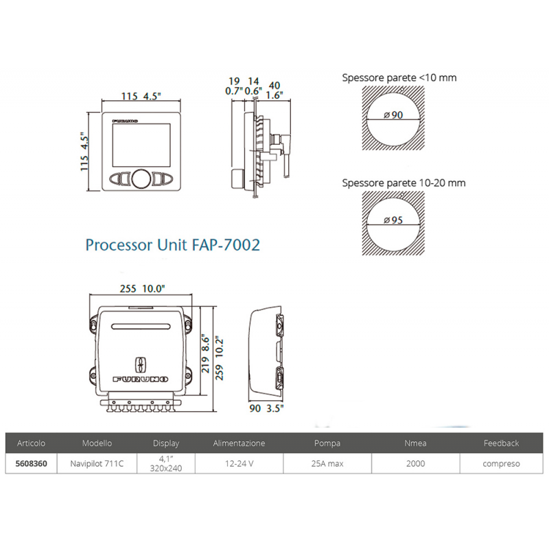Autopilota con display a colori da 4,1” e risoluzione da 320 x 240. Dotato di Tecnologia autoapprendente è capace di adattarsi costantemente alle condizioni marine per un mantenimento di rotta preciso, inoltre attivata la funzione Economy permette di risparmiare carburante. Idoneo perbarche a vela, la funzione Wind mode è in grado di compensare il vento e le correnti e effettuare la navigazione mantenendo constante la prua. Le Interfacce dati Nmea 0183 e Nmea 2000 inviano e ricevono tutti le informazioni necessarie al suo utilizzo e alla navigazione come i dati: bussola,velocità, vento (per la modalità Wind) e molti altri. Il processore può essere collegato sia ad una timoneria idraullica comandata da elettrovalvole, sia ad una timoneria dotata di pompa reversibile a 12 o 24 Vdc. Il kit comprende: display FAP-7001, processore FAP-7002, Rudder reference unit FAP-6112-200. Bussola e pompa reversibile escluse. Dim. display mm. 115H x 115 x 73. Alimentazione 12-24 Vdc.