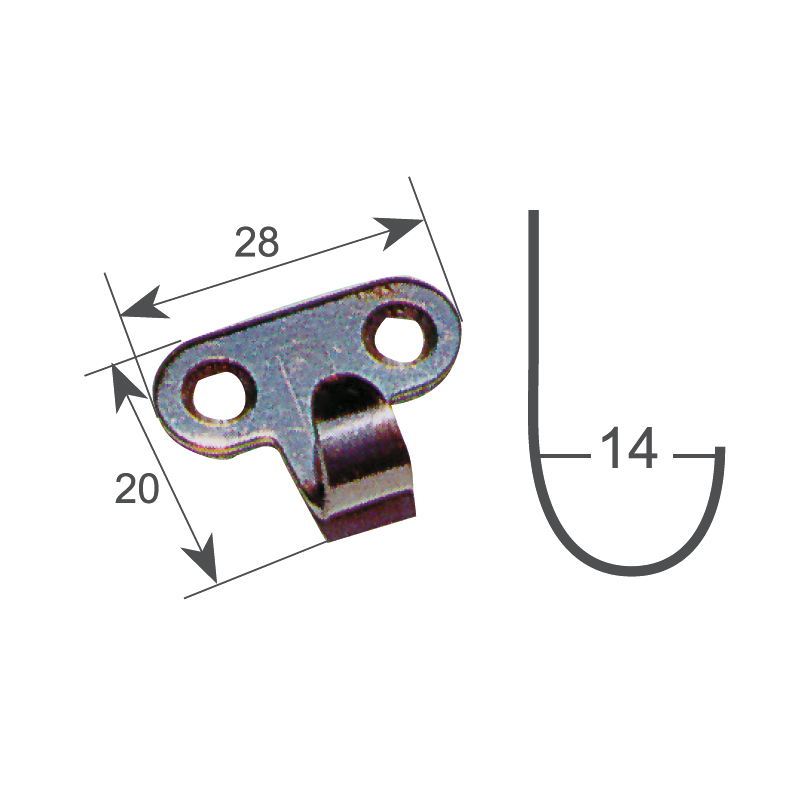 Gancetto in acciaio inox stampato, base con due viti di fissaggio. Dimensioni mm. 28x20x14.