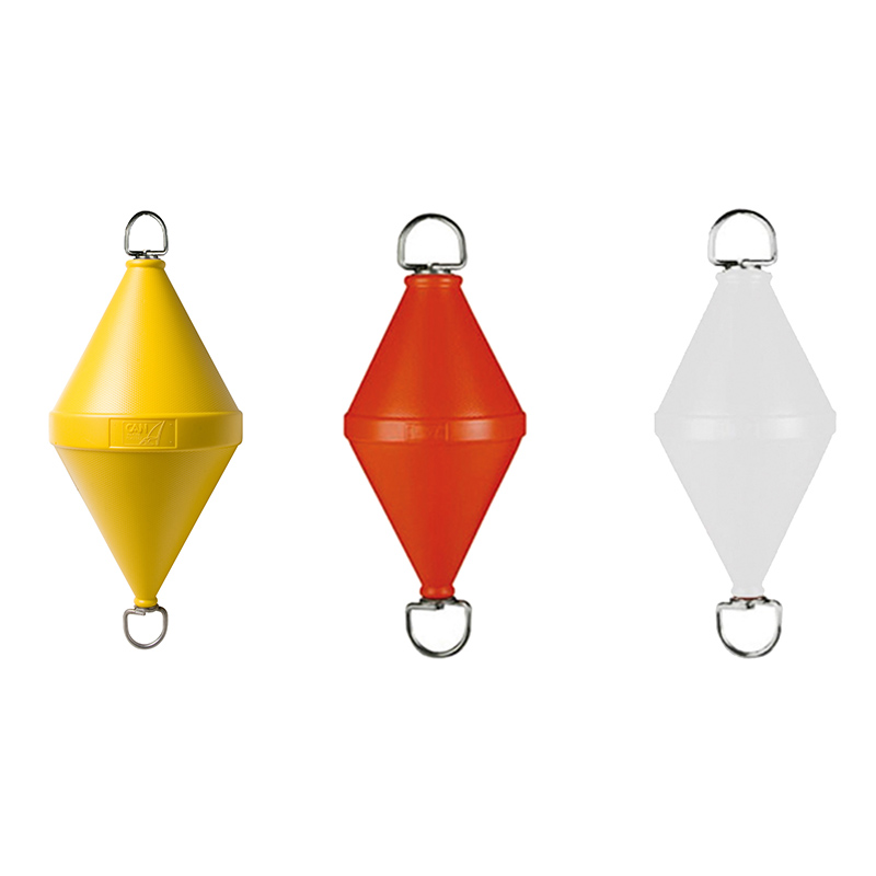 Gavitello biconicoda ormeggio in polietilene soffiato con asta passante Ø mm 13 e girelle in acciaio inox, riempito di poliuretano a cellule chiuse.