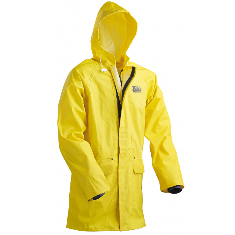 Cerata leggera ed impermiabile in poliestere giallo con spalmatura in PVC e cuciture saldate ad alta frequenza, dotata di cappuccio con coulisse e doppia chiusura (cerniera e velcro) sul davanti, ampie tasche con apertura a strappo e polsini aderenti con striscia elastica.