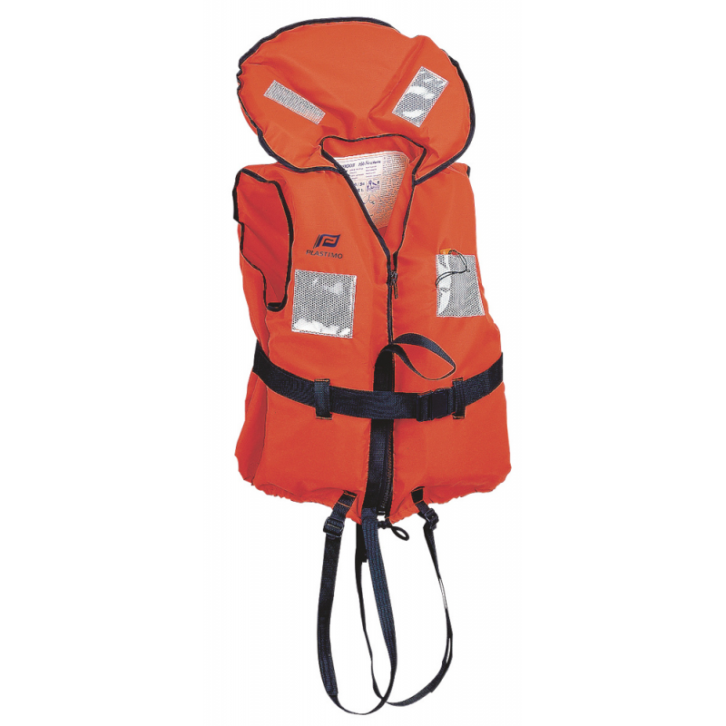 Giubbotto di salvataggio 150 Ncon collo ergonomico fabbricato con tessuto 100% poliestere di colore arancione fluorescente riempito di schiuma in polietilene. Munito di chiusura a zip, cintura di regolazione con fibbia in plastica e laccetto di serraggio in vita, doppia cinghia inguinale regolabile, strisce retroriflettenti e fischietto. CE EN ISO12402-3