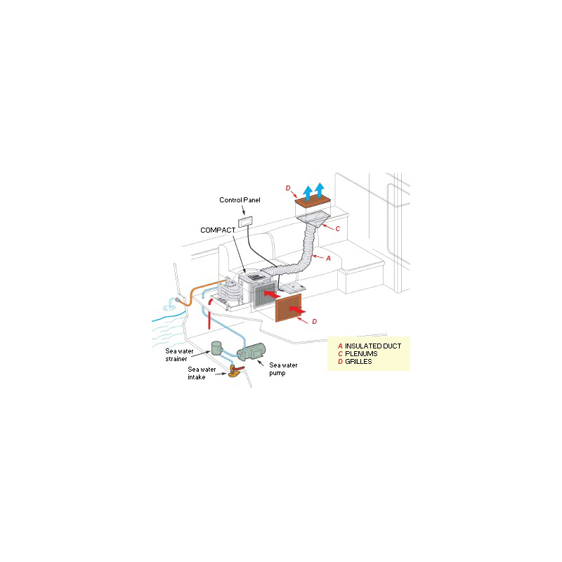 Impianto di condizionamento marino completo di tutto l’occorrente per una semplice e corretta istallazione a bordo. KIT COMPACT 3,5 RC - Impianto da 3500BTU/H. Il kit è studiato per condizio¬nare una cabina da 8mc. Irun 1,7A - I start 5,2 Amp, 300Wrun - 1200Wstart. Dimensioni mm 381 x 204 x 224H. Il kit contiene: Condizionatore Climma Compact, una scatola elettrica Climma, il pannello di controllo MK3 , un plenum, condotta isolata, griglia aspirazione e di mandata, pompa acqua mare (autoadescante per compact3.5), presa a mare, scarico acqua mare e filtro acqua mare