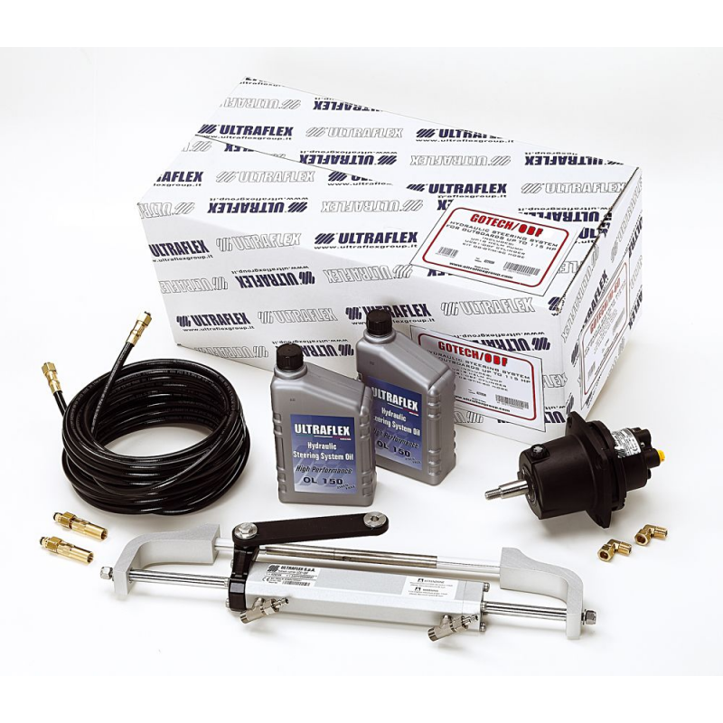 Sistema di guida fuoribordo, confezionato in kit per motorizzazione singola fino a 115 HP. Giri Volante n° 4,5. Il kit comprende :- pompa UP18 a montaggio semi-incasso- cilindro UC81-OBF a montaggio centrale- olio idraulico 2 lt.- Kit tubazioni da 1/4’ lunghezza mt.6 con raccordipressati ad una sola estremità