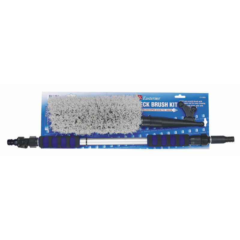 Kit pulizia ponte composto da asta in lega leggera telescopica (da cm. 64 a cm. 103) con impugnatura antiscivolo e attacco rapido per passaggio acqua interno, puntale mezzo marinaio, spazzola media durezza, ideale per la pulizia di tutte le superfici.